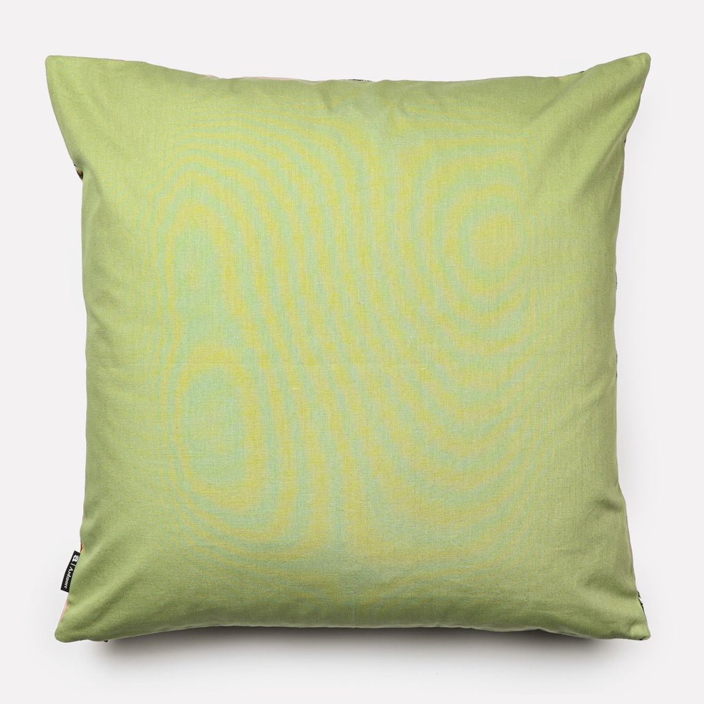 100% Cotton. Printed 50x50cm cushion in Lovebird Leopards design, magnolia colour. Back of cushion in pistachio coloured cotton.